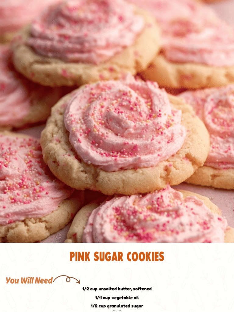 Deliciously soft, fluffy sugar cookies with a vibrant pink frosting, decorated with fun sprinkles. These cookies are the perfect treat for any occasion, offering a balance of sweetness and buttery goodness with a fun, playful twist.