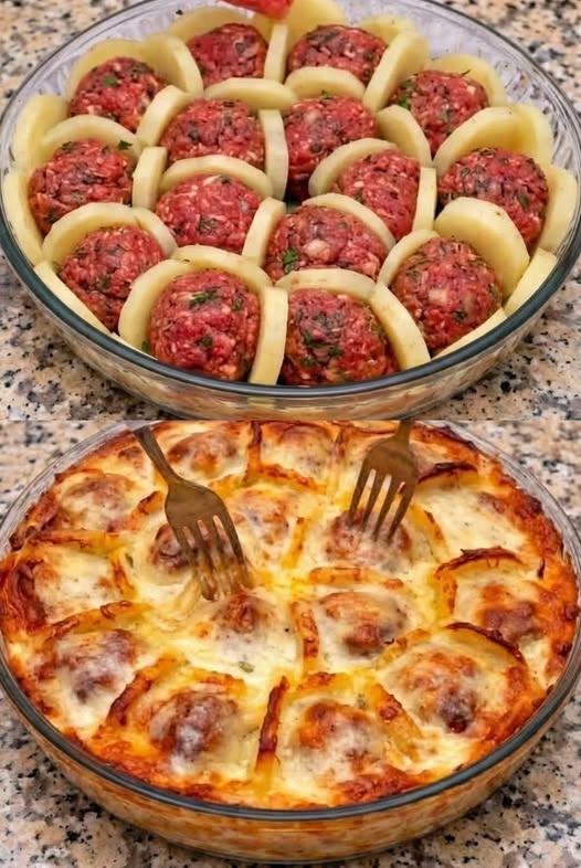 - Arrange potato slices and meatballs alternately in the dish (like in the photo).