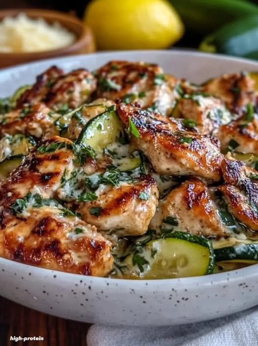 This high-protein, low-calorie skillet meal is fresh, light, and full of flavor. Tender chicken breast and sautéed zucchini are coated in a bright lemon-garlic sauce, making it perfect for a healthy weeknight dinner or meal prep.