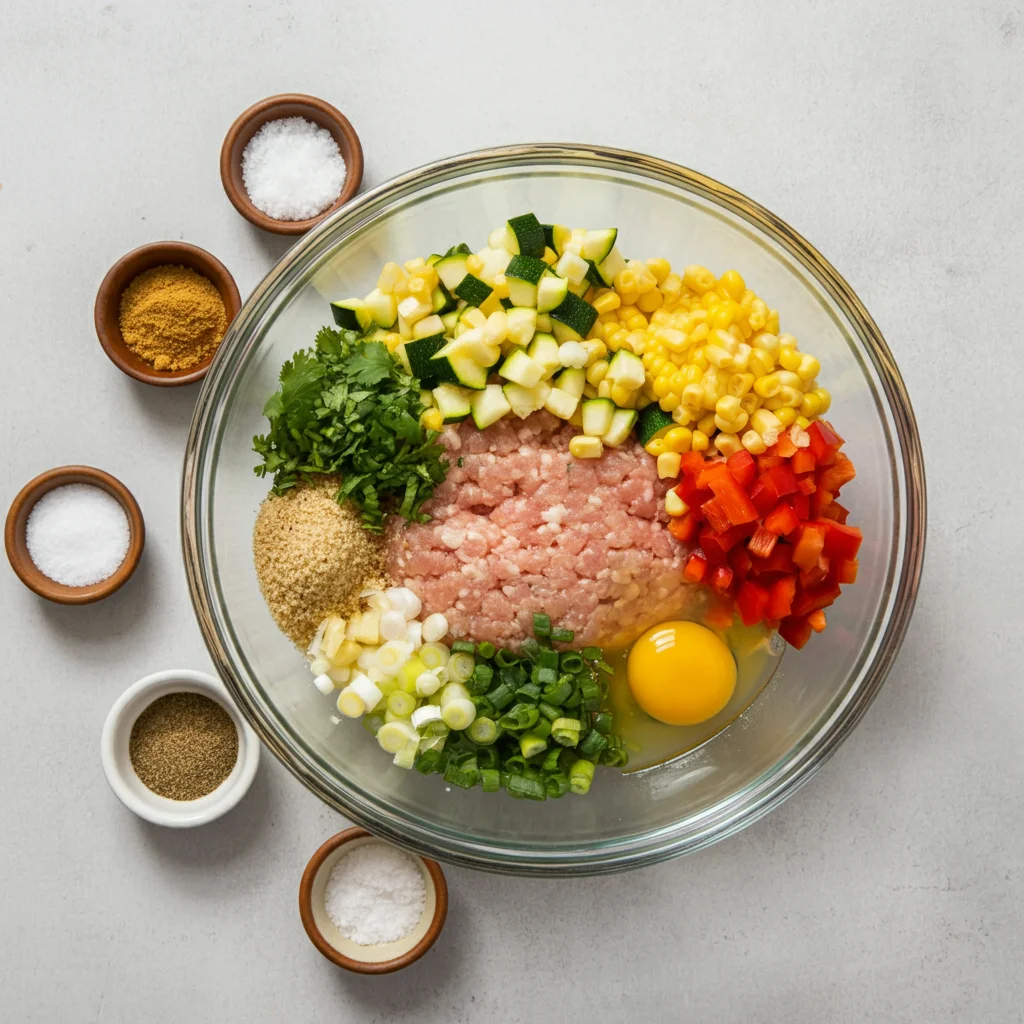 - Prepare the Burger Mixture: Mix the ground chicken with grated zucchini, fresh corn, red bell pepper, green onions, egg, breadcrumbs, cilantro, garlic, and spices. This mixture is super flavorful and packed with fresh veggies.