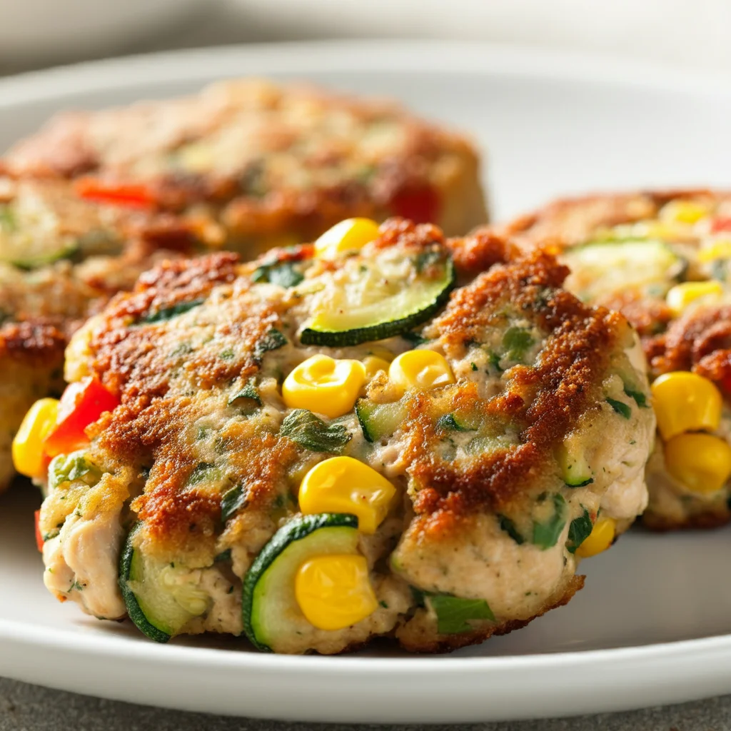 These aren’t your average chicken patties—oh no. We’ve mixed in fresh veggies like zucchini and red bell pepper, along with sweet corn, to add a burst of texture and flavor.