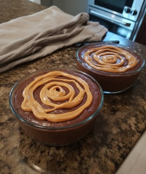 - Pour the mixture into ramekins and swirl peanut butter.