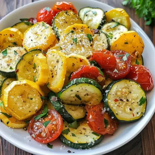 This roasted vegetable dish combines tender zucchini, sweet squash, and juicy tomatoes with garlic, herbs, and a savory Parmesan finish. Roasting brings out natural sweetness while creating lightly caramelized edges—making it a perfect healthy side or light meal.