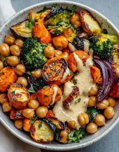 A warm, nourishing, plant-based bowl loaded with roasted veggies, crispy chickpeas, and a creamy lemon–tahini drizzle.
