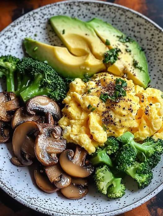 - Gently fold the sautéed mushrooms and broccoli into the scrambled eggs.