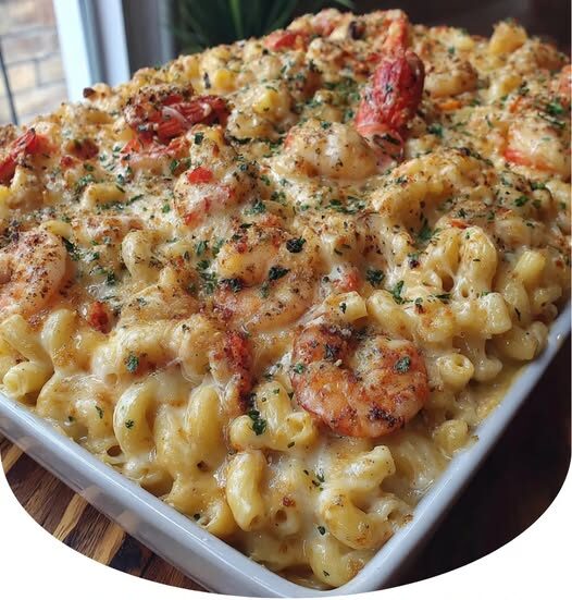 Creamy macaroni with shrimp, crab, and crawfish in a savory, golden-baked cheese topping for hearty comfort.