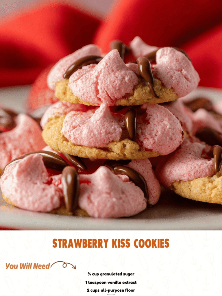 Soft and delicate sugar cookies with a colorful, creamy strawberry meringue topping, finished with a decadent chocolate kiss. These festive cookies are perfect for Christmas or any occasion when you need a little extra sweetness.