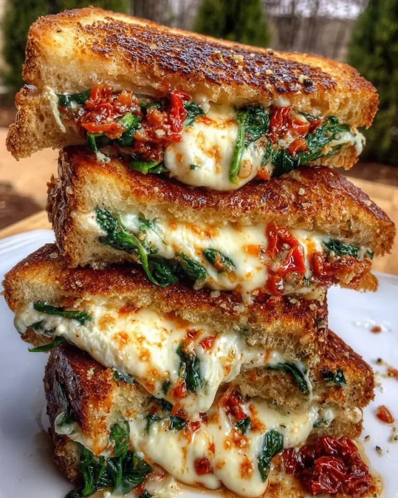 This Sun-Dried Tomato, Spinach, and Ricotta Grilled Cheese is a golden, melty, flavor-packed sandwich layered with creamy cheeses, wilted spinach, and bold sun-dried tomatoes for the ultimate cozy lunch or dinner.