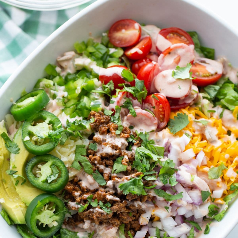 This Taco Salad combines seasoned ground beef, crisp romaine lettuce, and classic toppings like salsa, cheese, sour cream, and avocado for a fresh, filling, and flavorful meal. It’s a simple, crowd-pleasing recipe that delivers all the bold flavors of tacos — without the shells!