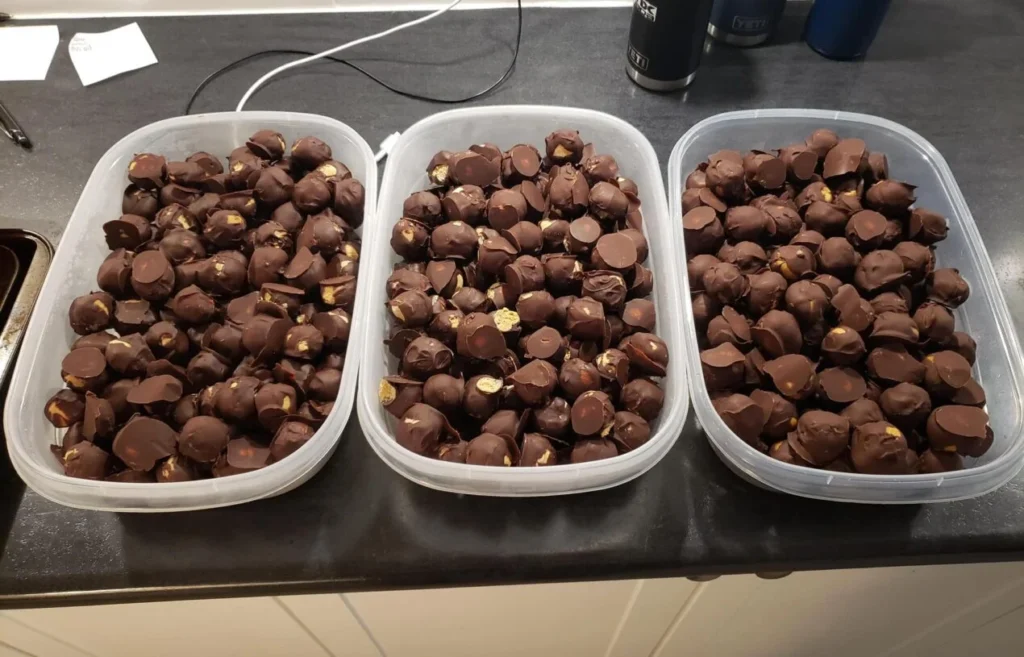 - With precision and care, dip each peanut butter bliss ball into the luscious melted chocolate, ensuring an even coating for an irresistible finish.